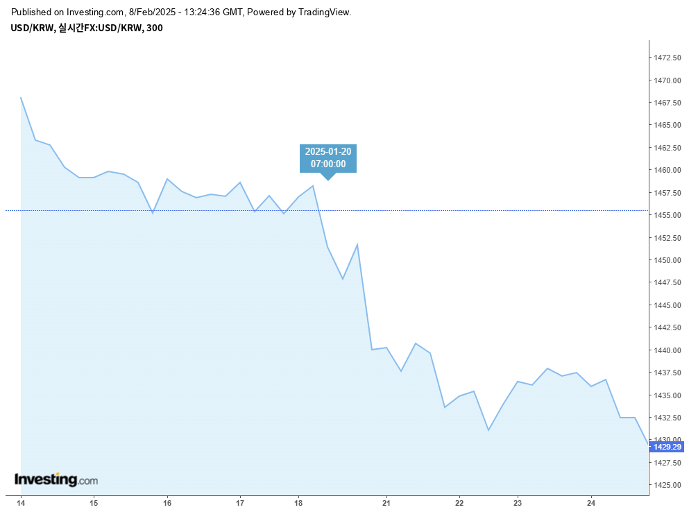📌 1. 환율 분석✅ 1주일 간 환율 변동 개요최고점: 1,455.8원 (1월 20일)최저점: 1,434.3원 (1월 23일)변동 폭: 약 21.5원주간 평균: 약 1,443.62원전주 대비 변동: 하락 (-18.7원)📈 환율 추세 분석1월 20일(월) 환율은 1,455.8원으로 시작하여 주초에는 상대적으로 높은 수준을 유지하였음.그러나 1월 21일~23일 사이 지속적인 하락세를 보이며, 1월 23일(목) 1,434.3원으로 최저점을 기록.1월 24일(금)에는 소폭 반등하여 1,437.1원으로 마감.전주 대비 하락세가 뚜렷, 특히 중반 이후 하락 속도가 가팔랐음.✅ 변동 원인 분석미국 경제 지표 영향: 미국의 인플레이션 완화 신호가 강화되면서 연준(Fed)의 금리 인하 가능성이 높아졌음. 이에 따라 ..