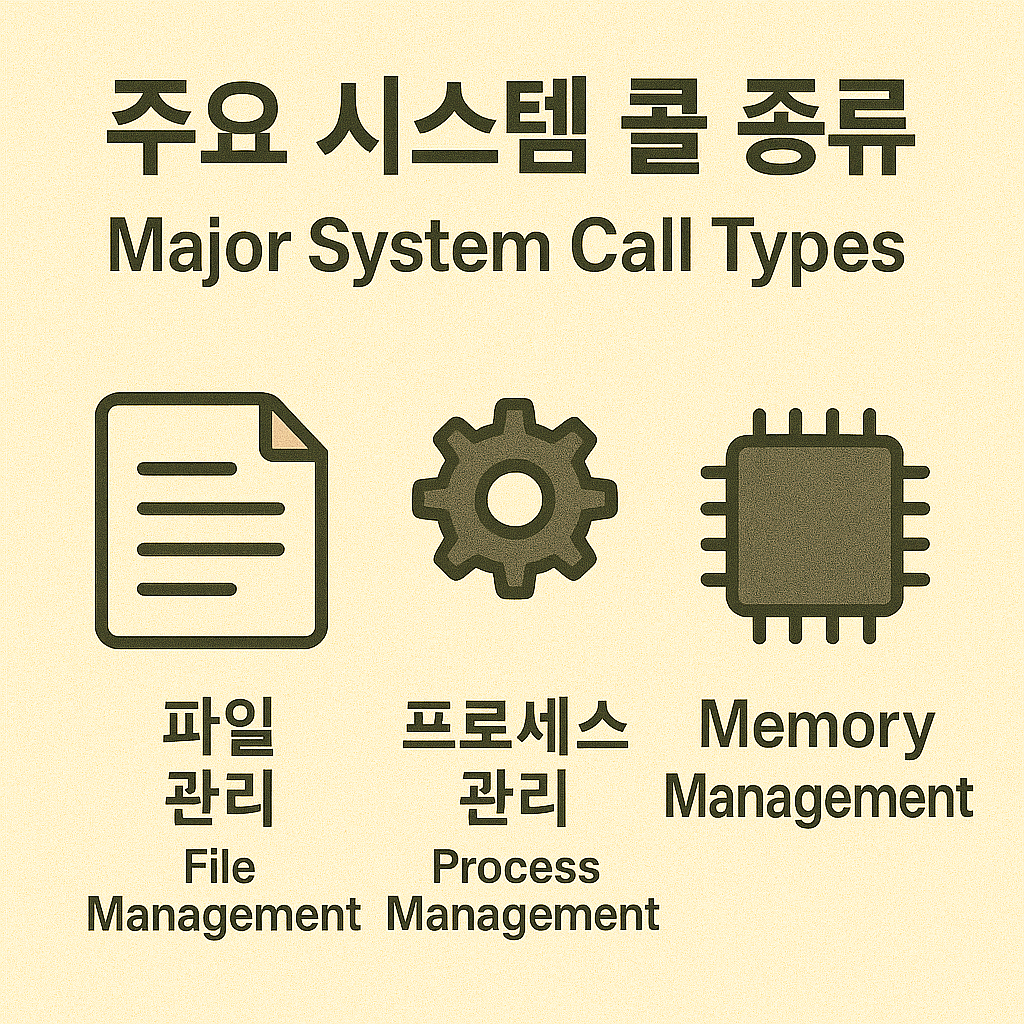 [운영체제 목차 바로가기]2️⃣ 운영체제의 구조 - 시스템 콜(System Call)과 API 📌 주요 시스템 콜 종류 (파일 관리, 프로세스 관리, 메모리 관리)운영체제는 다양한 하드웨어 자원과 기능을 제공하지만, 사용자 프로그램은 시스템 콜(System Call)을 통해서만 커널 기능을 사용할 수 있다.그중에서도 실무와 교육에서 자주 다뤄지는 핵심 시스템 콜 세 가지는 다음과 같다:파일 관리 시스템 콜프로세스 관리 시스템 콜메모리 관리 시스템 콜1️⃣ 파일 관리 시스템 콜 (File Management System Calls)파일 시스템은 운영체제의 핵심 기능 중 하나이며, 파일을 열고 읽고 쓰고 닫는 일련의 작업은 모두 시스템 콜을 통해 커널에 요청된다.주요 시스템 콜 목록시스템 콜설명open()..